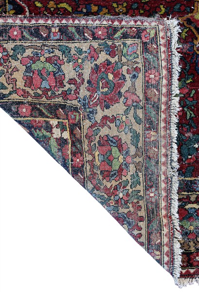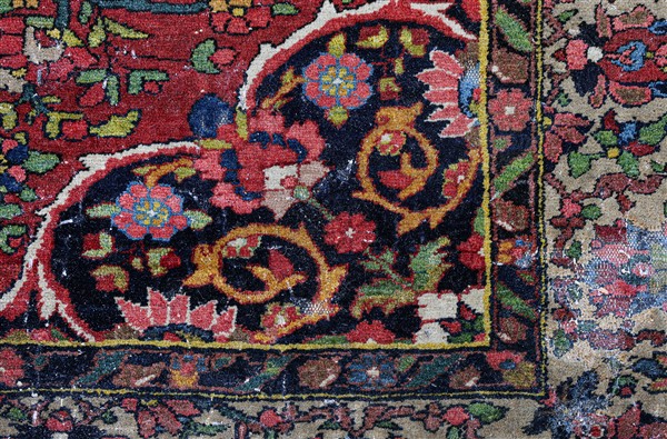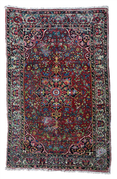 Tappeto Teheran, Persia, secolo XX. Decoro con medaglione polilobato con puntali su fondo rosso (cm 210x138) (gravi difetti e rapature)