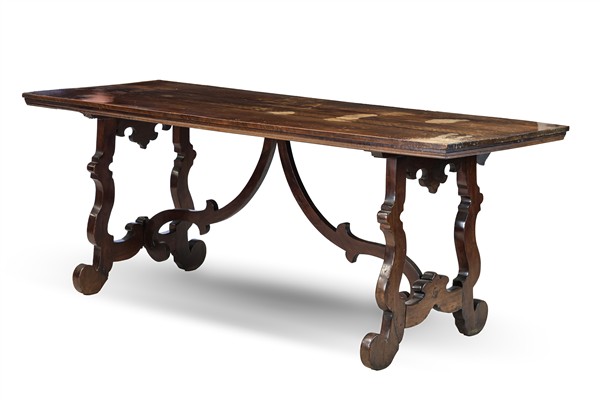 Tavolo fratino in legni vari con piano rettangolare, gambe a lira e traverse sagomate (cm 199x78x75) (difetti)