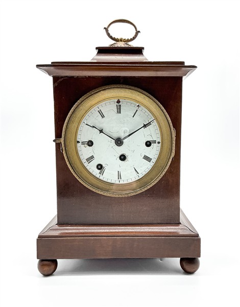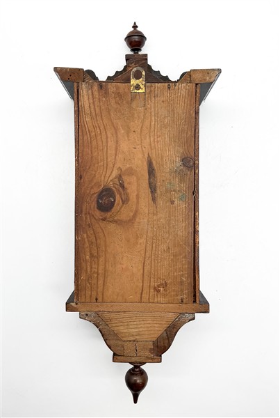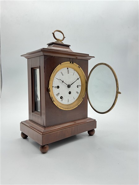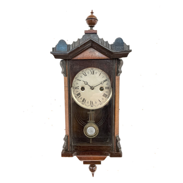 Pendola da appoggio di forma parallelepipeda con cassa in legno e quadrante in smalto bianco a numeri romani, movimento a tre treni con sveglia. Probabilmente Austria, secolo XIX (h. cm 32). Unita a orologio da parete in legno con quadrante in metallo a numeri romani per le ore e arabi per i minuti con suoneria su gong (h. cm 53) (mancanze e restauri)