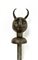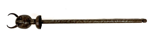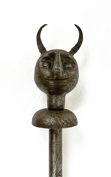 Mazza cerimoniale in metallo inciso con testa di diavolo sferica sopra un colla