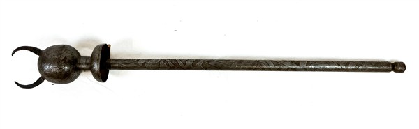 Mazza cerimoniale in metallo inciso con testa di diavolo sferica sopra un collare emisferico Persia, secolo XIX-XX (h. cm 71) (difetti)