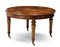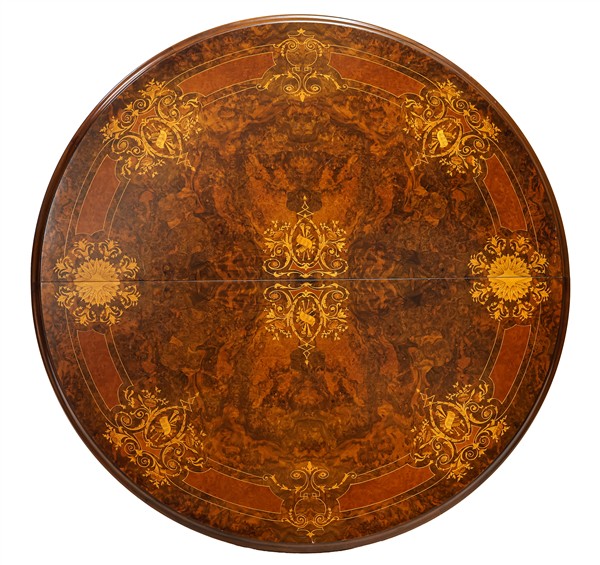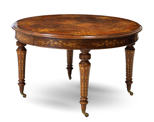 Tavolo allungabile impiallacciato e intarsiato in radica e legni chiari di varie essenze, gambe a balaustro su rotelle. Fine secolo XIX (cm aperto 250x77x129) Dotato di due allunghi originali (L cm 60 cad.) (difetti e mancante della manovella)