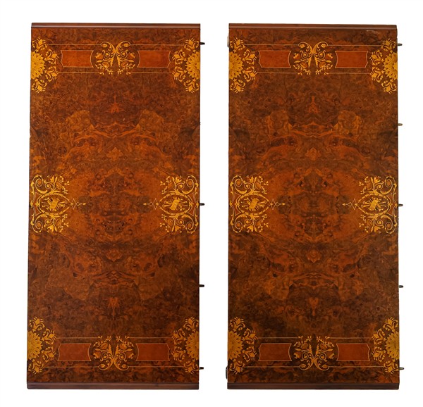 Tavolo allungabile impiallacciato e intarsiato in radica e legni chiari di vari
