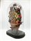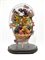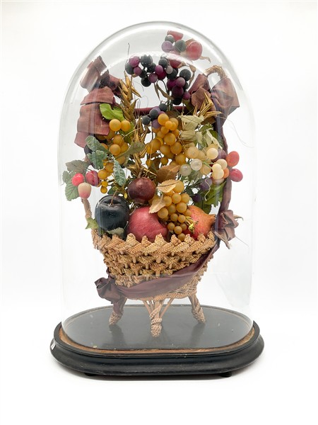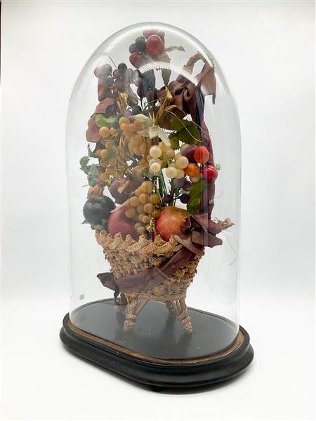 Composizione con frutti su cesto in materiali vari entro campana in vetro su ba