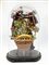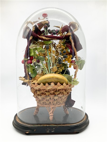 Composizione con frutti su cesto in materiali vari entro campana in vetro su base in legno ebanizzato (cm 36x21x57) (difetti)