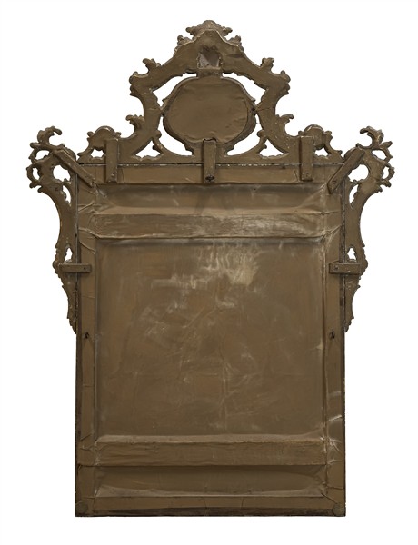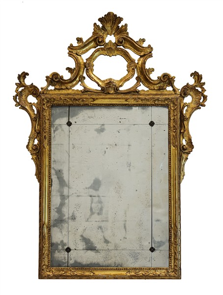 Specchiera in legno intagliato e dorato, cimasa centrata da valva di conchiglia e volute contrapposte. Veneto, secolo XIX-XX (cm 101x76)