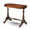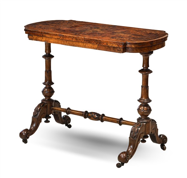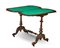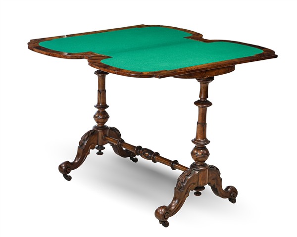 Tavolino da gioco impiallacciato in radica e filettato in legno chiaro, piano sagomato ribaltabile con panno verde, sostegni e traversa torniti, piedi a ricciolo su rotelle. Secolo XIX (cm chiuso 91x73x48) (difetti)