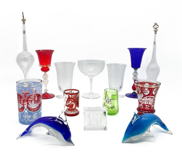 Cartone contenente numerosi oggetti in vetro tra cui calici, bicchieri e due vasi di Baccarat (h max cm 39) (difetti)