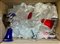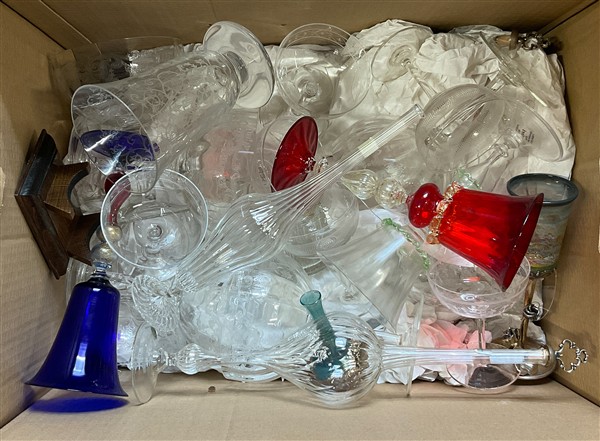 Cartone contenente numerosi oggetti in vetro tra cui calici, bicchieri e due va