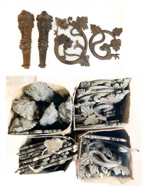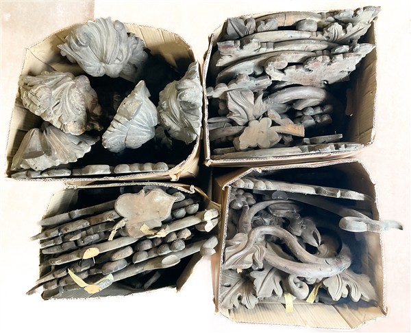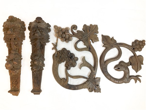 Quattro cartoni contenenti numerosi fregi in legno intagliato a mascheroni con festone di frutti e a tralci di vite (difetti e rotture)