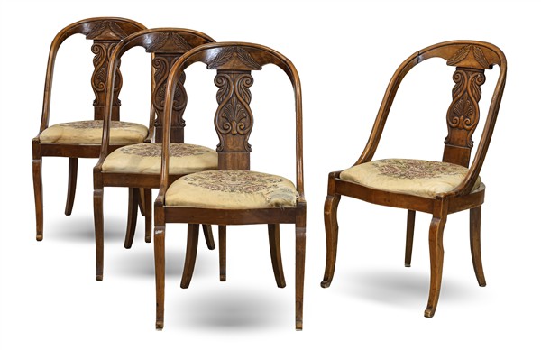 Gruppo di quattro sedie a gondola in noce con schienale a cartella sagomata e decorata a palmette, gambe posteriori a sciabola e anteriori mosse. Secolo XIX. Sedute asportabili rivestite in tessuto operato (difetti)