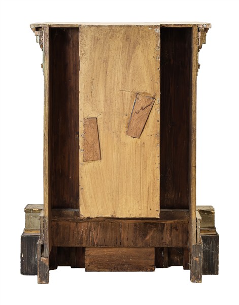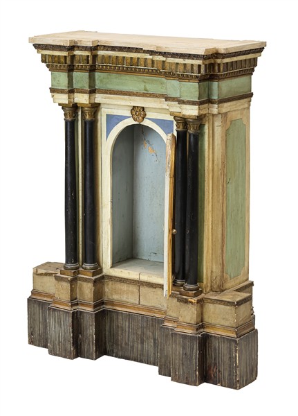 Fronte di tabernacolo in legno dipinto e dorato ad un'anta centinata fra coppie di colonnine ebanizzate su base sagomata. Secolo XIX (cm 75x96x30) (difetti, restauri e sostituzioni)