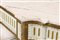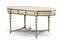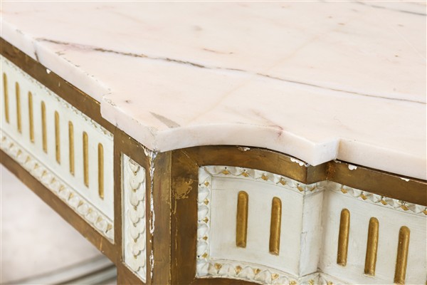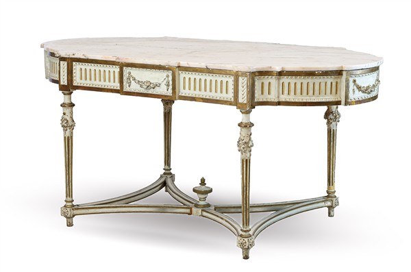 Tavolo da centro in legno laccato e dorato con piano mistilineo, gambe scanalate e raccordate da crociera centrata da pinnacolo. Piano in marmo sagomato. Fine secolo XIX (cm 176x82,5x94,5) (difetti e restauri)