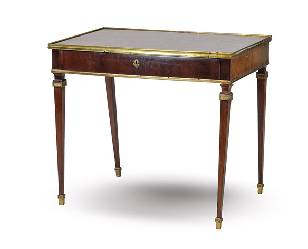 Scrittoio da centro in mogano con profili in bronzo dorato, fascia ad un cassetto, gambe rastremate (cm 87,5x75x56,5) (difetti e rotture)