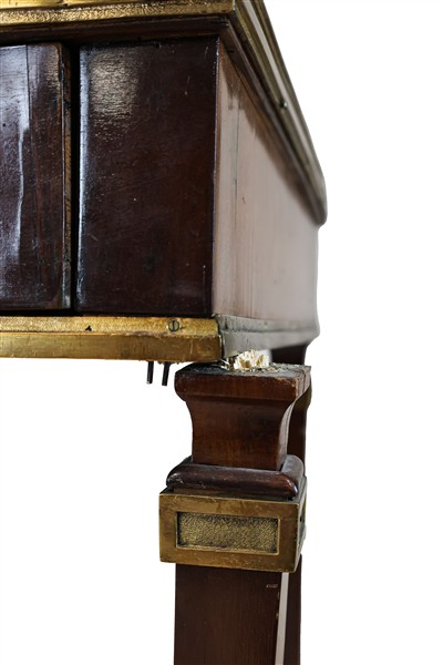 Scrittoio da centro in mogano con profili in bronzo dorato, fascia ad un casset