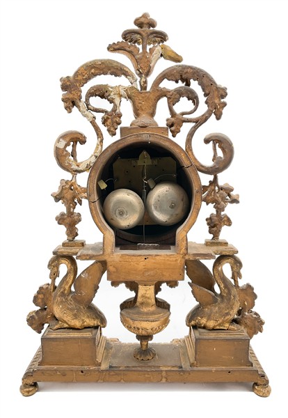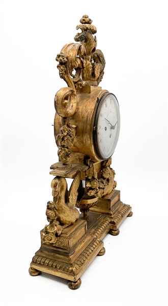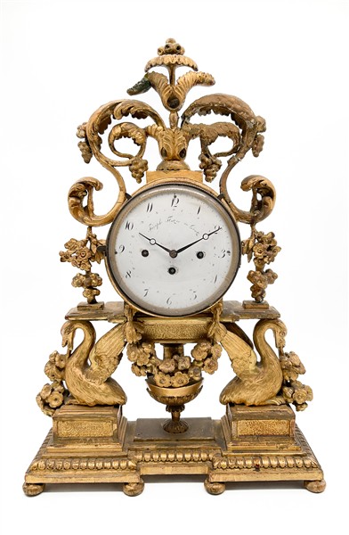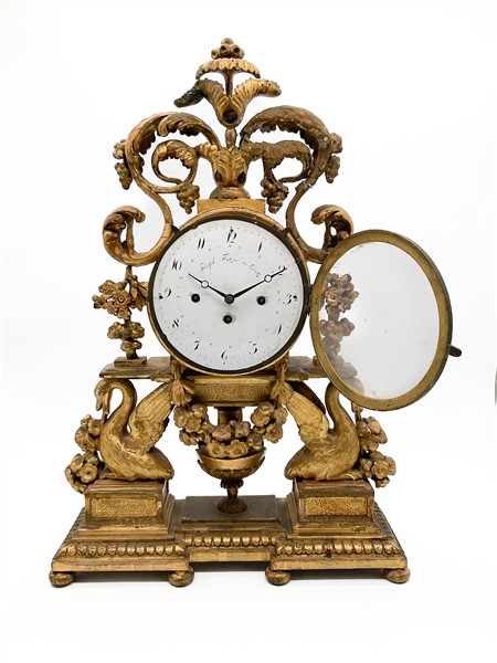 Pendola da appoggio in legno intagliato e dorato con cassa decorata da cigni, girali e ghirlande di fiori. Quandrante in smalto bianco a numeri arabi, movimento a tre treni con suoneria delle ore e dei quarti su campanelli. Austria, fine secolo XVIII (h. cm 56) (difetti e mancanze)