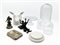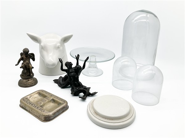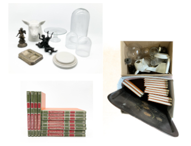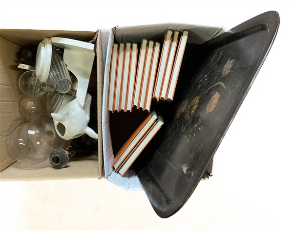 Due cartoni contenenti numerosi oggetti in vetro, porcellana e altri materiali, alcuni volumi inerenti l'antiquariato e un vassoio in tolla dipinta (difetti)