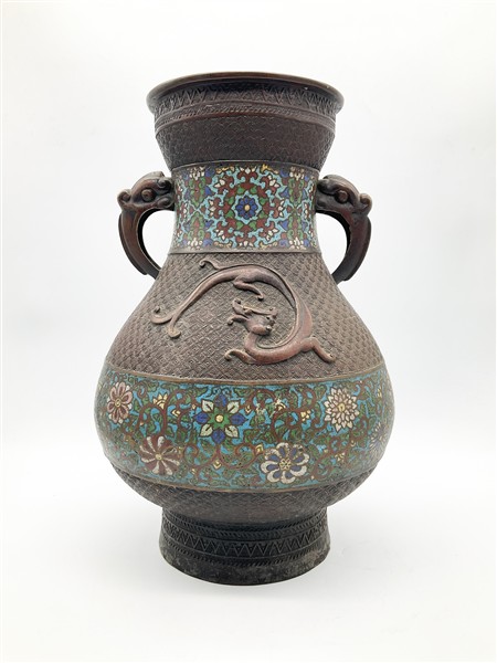 Grande vaso a balaustro biansato in metallo cloisonnè decorato a fasce a motivi floreali e draghi stilizzati a rilievo