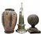 Lotto composto da un obelisco rivestito a specchi molati (h cm 47), un vaso in gesso con decori in pastiglia a foglie (h cm 35) e un elemento decorativo in legno intagliato a pigna (h cm 27) (difetti e mancanze)