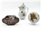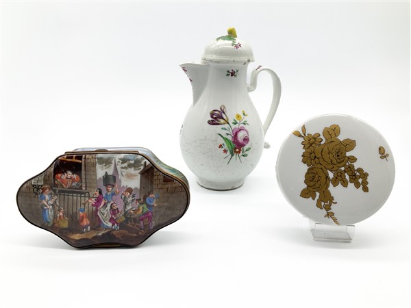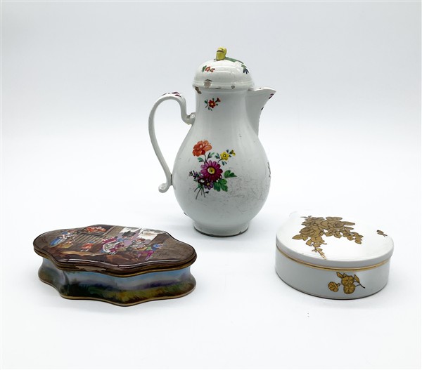 Lotto composto da una caffettiera in porcellana dipinta in policromia a mazzi di fiori, Vienna, secolo XIX; una scatola con coperchio in porcellana dipinta a scena di festa popolare e una moderna profilata in oro con elementi floreali, Rosenthal (h max cm 21) (difetti)
