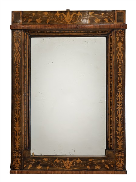Specchiera con cornice lastronata e intarsiata in legni di varie essenze a volute fiorite e candelabbra nei montanti. Secolo XIX (cm 96x68) (difetti)