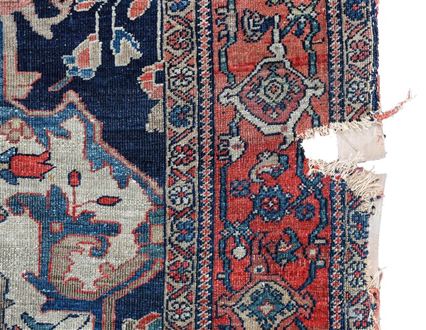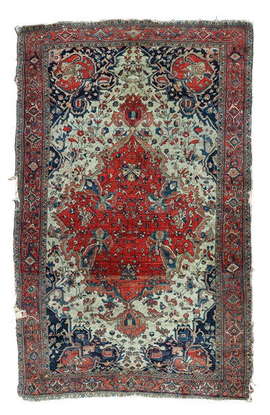 Tappeto Sarouk, Persia, fine secolo XIX. Decoro con grande medaglione rosso con puntali su fondo bianco (cm 200x135) (difetti, rapature e strappi)