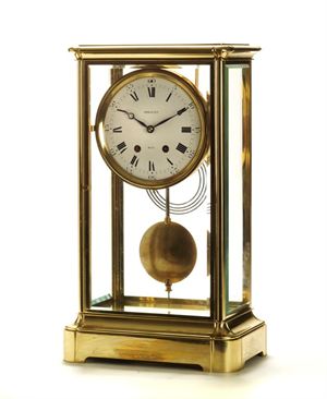 Cassa a parallelelpipedo in ottone lucido e vetri molati, quadrante in smalto con doppia numerazione romana ed araba firmato "Breguet" e numerato 4654, movimento parigino con suoneria delle ore e delle mezze su gong firmato. Completa di Chiave di carica e pendolo.