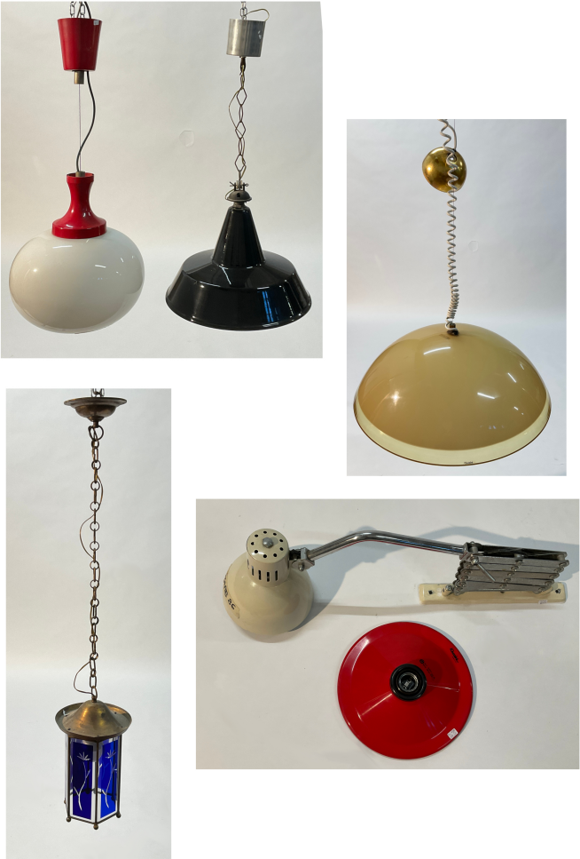 Lotto composto da quattro diverse lampade a sospensione, una plafoniera e una lampada da parete estensibile, in metallo, vetro e plastica. Italia, anni '70. (difetti)