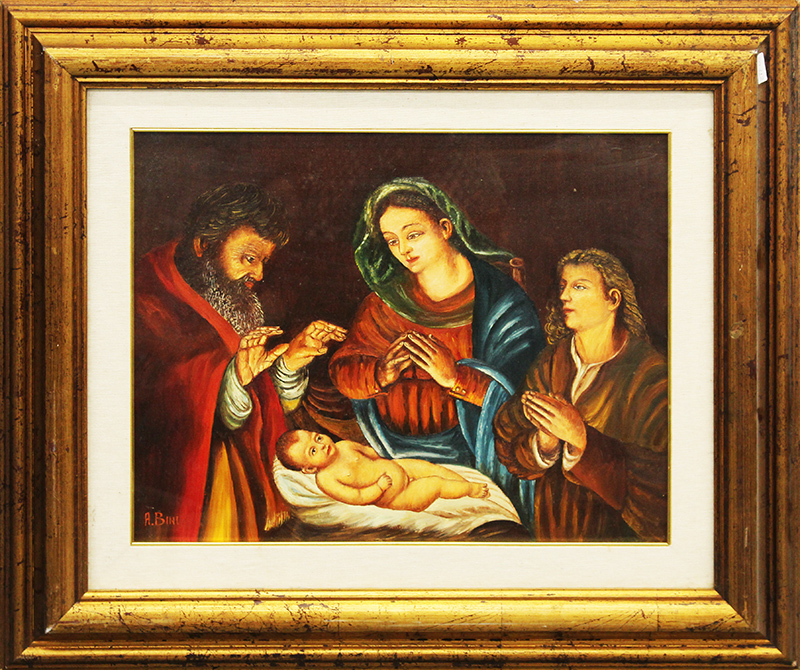ANTERO BINI, "Adorazione dei Magi", anni '70, olio su tela, dim 39x48. Al fronte: firma in basso a sinistra. Al verso: in alto a sinistra titolo, nel centro nome artista e al centro timbro dell'artista. Opera con cornice.
