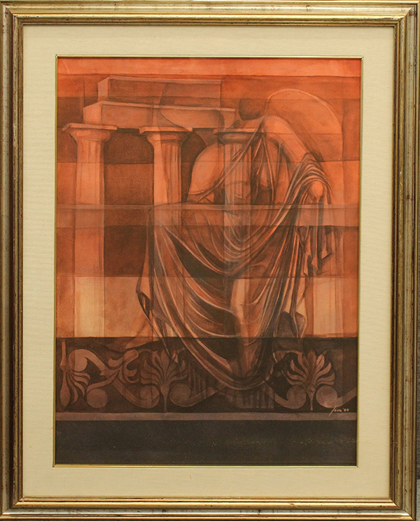 CLEMENTINO FAVA, "Nike", 1982, olio su tela, cm 70x50, con cornice 87x68x3,5 cm, 4,55 kg. Al verso: firmato ed etichetta con informazioni, Al fronte: datato e firmato in basso a destra. Certificato di provenienza della Daliano Ribani Arte. Opera con cornice in omaggio.