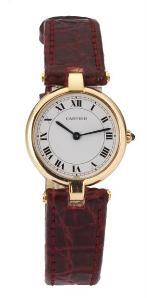 CARTIER Modello "Vendome" anni '90 in oro giallo Diametro 24 mm Cassa in due corpi con anse particolari. Quadrante con numeri romani serigrafati, minuteria a binario lancette a gladio in acciaio azzurrato. Movimento al quarzo. An yellow gold "Vendome" model 90's