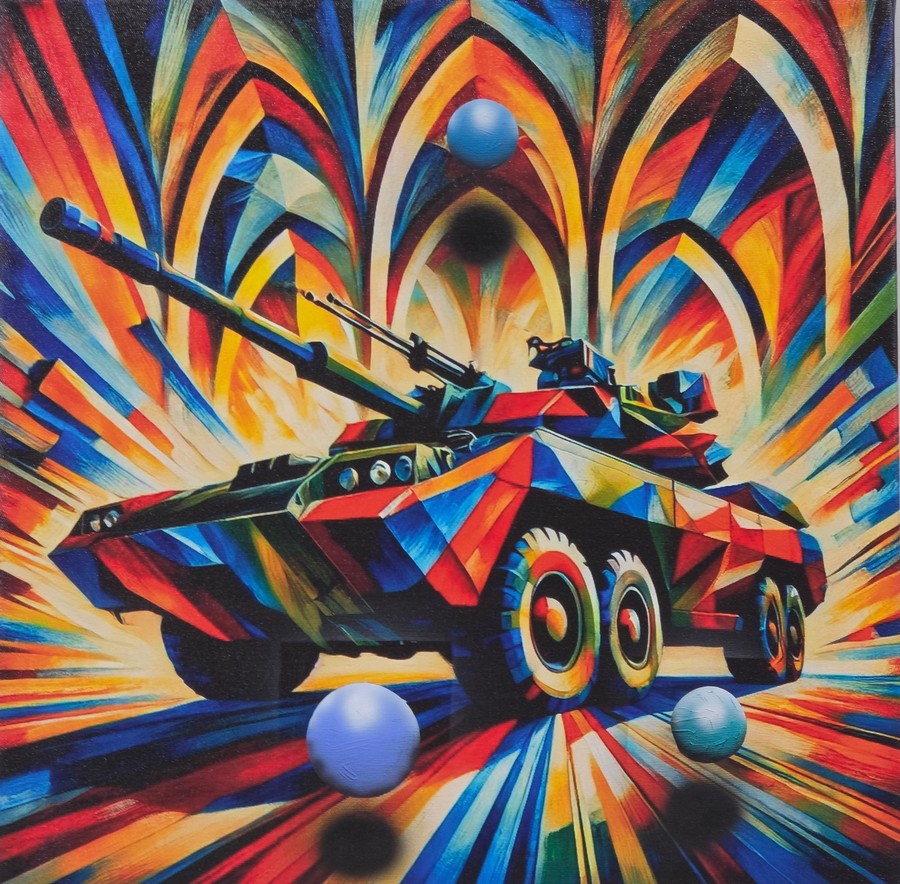 CHIESA RENATO NATALE (n. 1947) CARRO ARMATO . 2025. Inchiostro e acrilico su tela.. Cm 63,00 x 63,00 x 4,00. sul retro: firma e timbro dell'artista