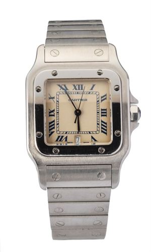 CARTIER Santos Galbè anni 90 in acciaio misura unisex 30x30 mm Cassa di forma carrè in 3 copri con lunetta fermata da viti, bracciale integrato, quadrante con indici a numeri romani serigrafati e minuteria a binario, lancette a gladio in acciaio azzurrato A stainless steel Santos Galbè 90s