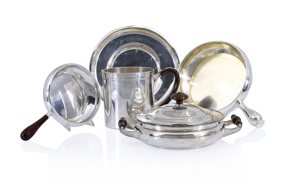 UNA PADELLA CON MANICO IN LEGNO, MILANO, GENAZZI, ANNI '70; UN TEGAME CON COPERCHIO, UN BRICCO, UNA PADELLA E UN PIATTO IN ARGENTO, XX SECOLO; alcune parti in legno.