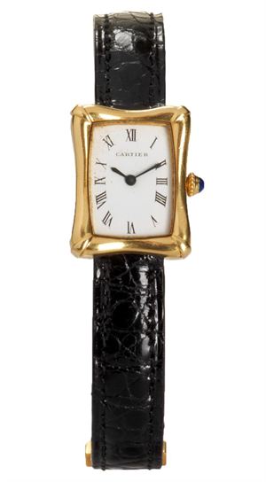 CARTIER Modello Bamboo anni '70 in oro giallo Diam 25x20 mm Cassa di forma rettangolare con parte superiore riproducente i rami del bamboo, corona con zaffiro cabochon, quadrante smaltato con cifre romane, movimento a carica manuale Bamboo Model 70s in yellow gold