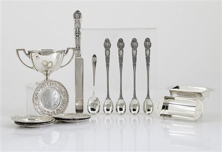 LOTTO DI DIVERSI OGGETTI IN ARGENTO, TIFFANY & CO., INIZIO XX SECOLO, composto da una coppetta biasata, due vaschettine, sei piattini con bordo a rilievo, quattro cucchiai da cocktail, un coltello e un cucchiaio liscio.