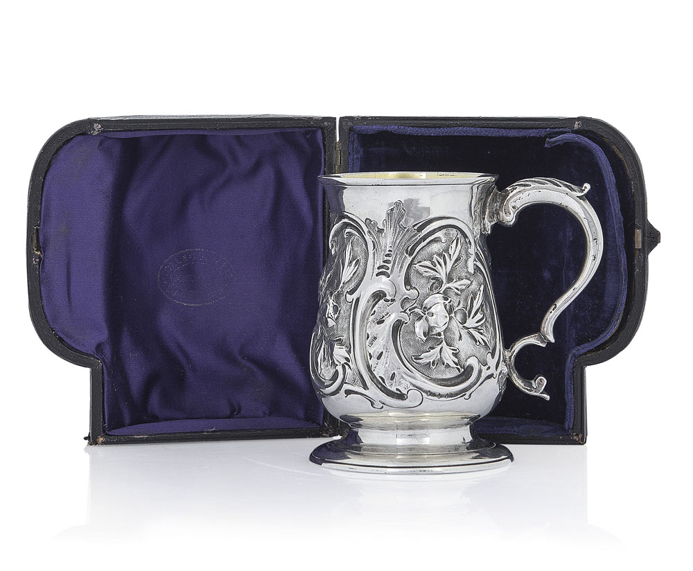 MUG GIORGIO III IN ARGENTO, LONDRA, 1774, sbalzato a motivi floreali con manico a voluta e interno vermeil; entro cofanetto.