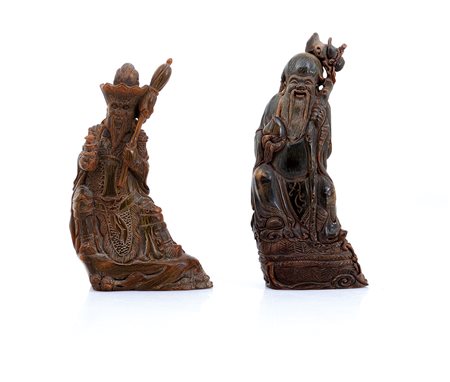 DUE SCULTURE IN CORNO, CINA, XIX SECOLO, raffiguranti immortale simbolico della longevità e un Imperatore.