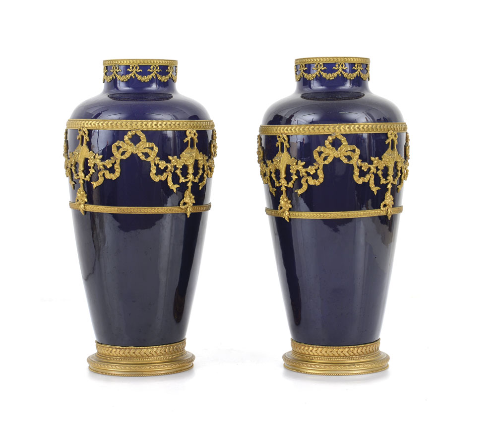 COPPIA DI VASI IN CERAMICA CON MONTATURA IN METALLO DORATO, XIX SECOLO, a balaustro con decori a nastri e fiori su base gradinata.