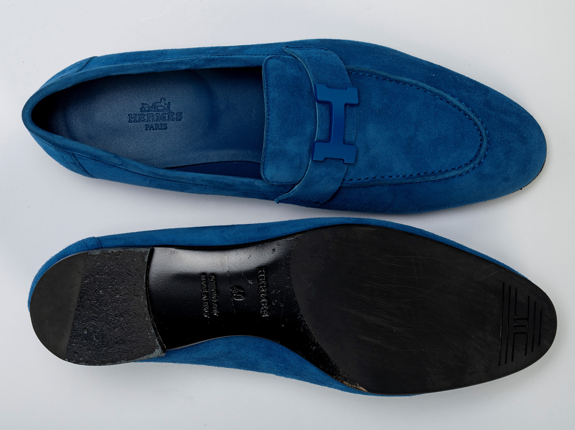 in camoscio color bluette con fibbia H, misura 40, con sacchetto (lievissimi segni d'uso)in camoscio color bluette con fibbia H, misura 40, con sacchetto (lievissimi segni d'uso)