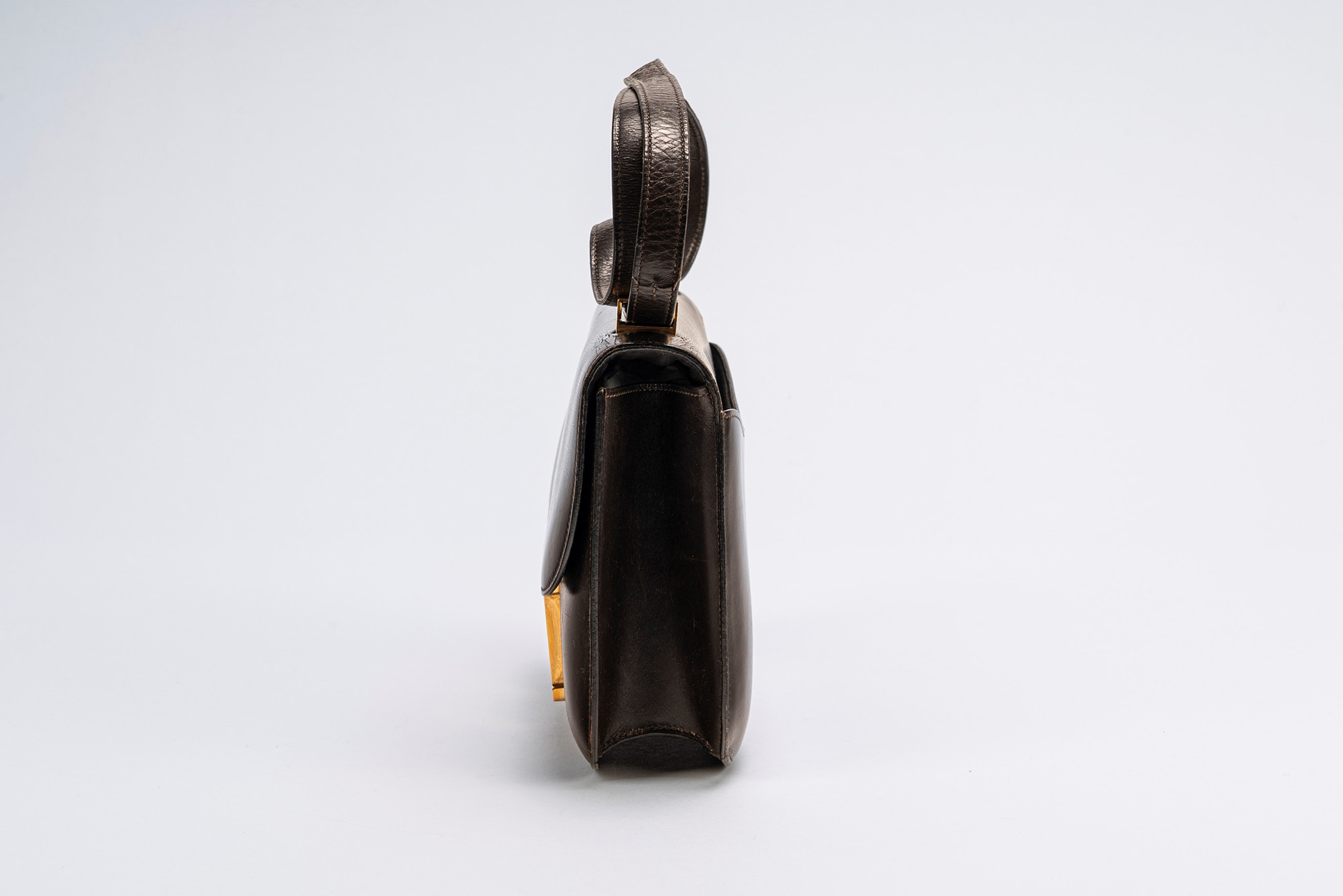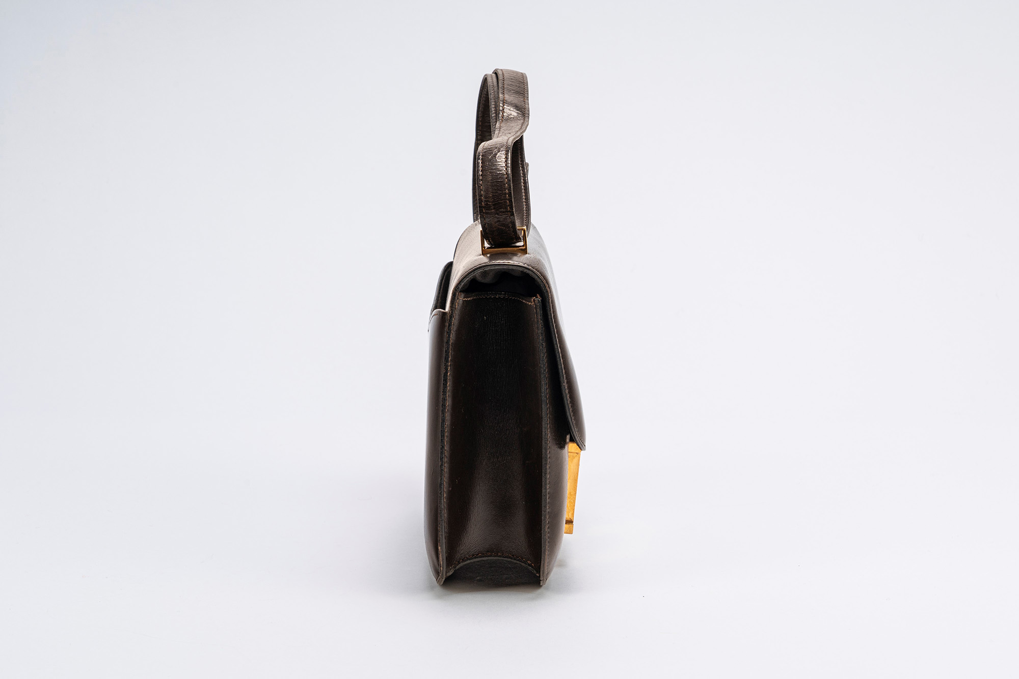 in pelle box color testa di moro, dettagli in metallo dorato, cm 22, (segni d'uso e del tempo)in pelle box color testa di moro, dettagli in metallo dorato, cm 22, (segni d'uso e del tempo)