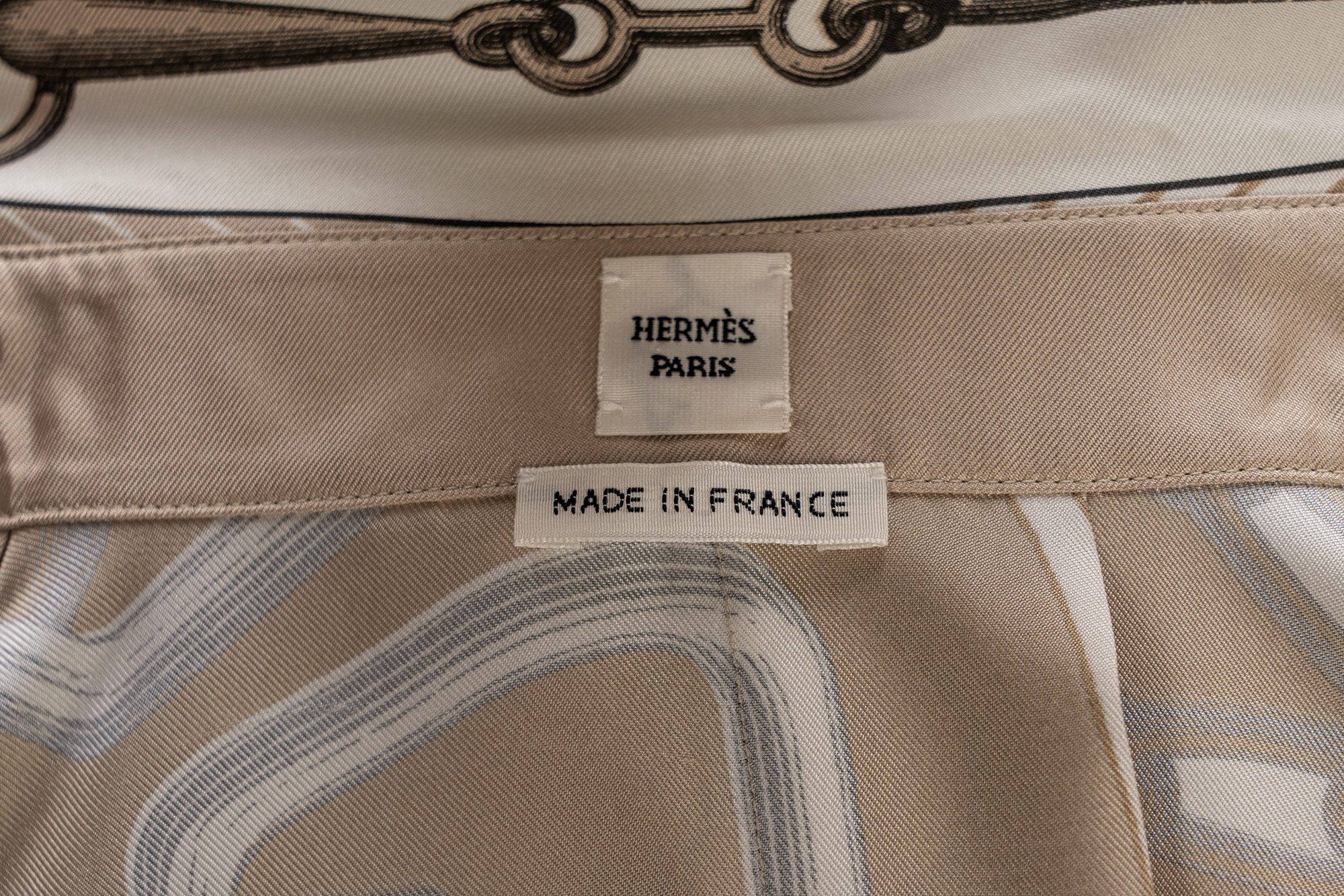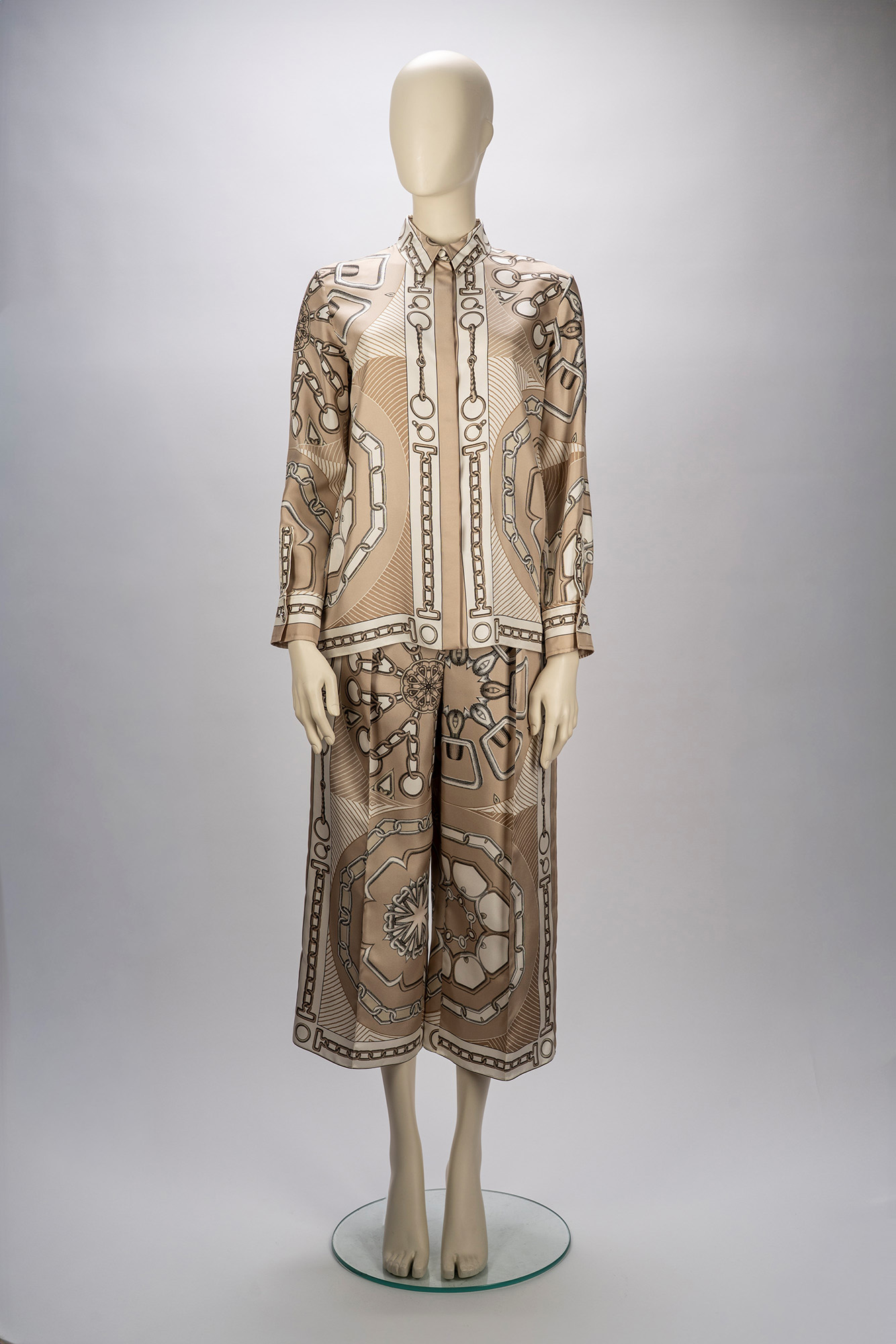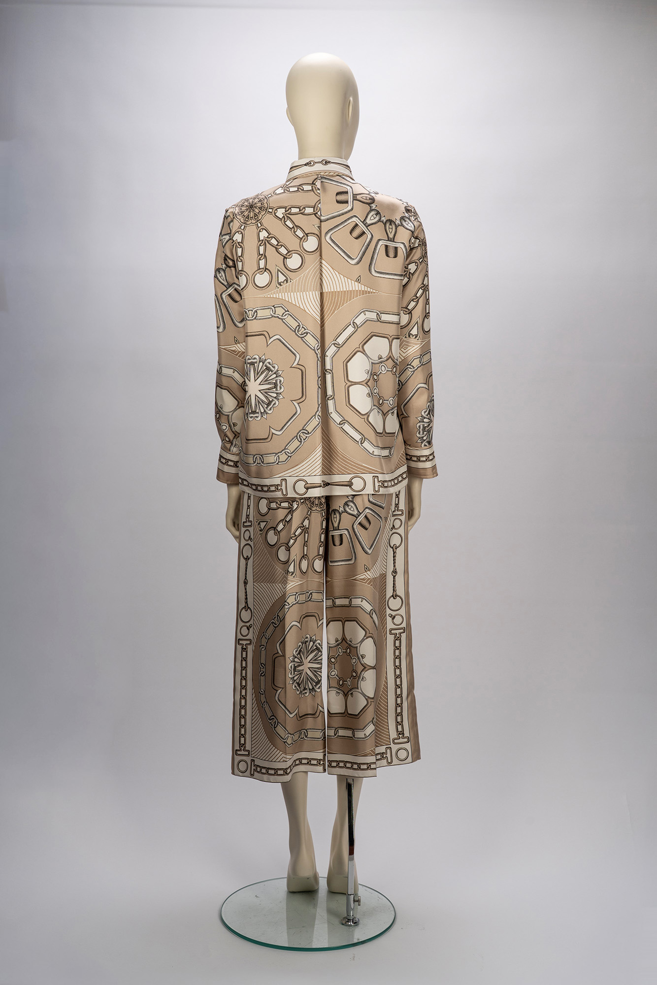 camicia a manica lunga taglia 36, e pantalone in seta color beige e panna stampa effetto caleidoscopio taglia 38camicia a manica lunga taglia 36, e pantalone in seta color beige e panna stampa effetto caleidoscopio taglia 38