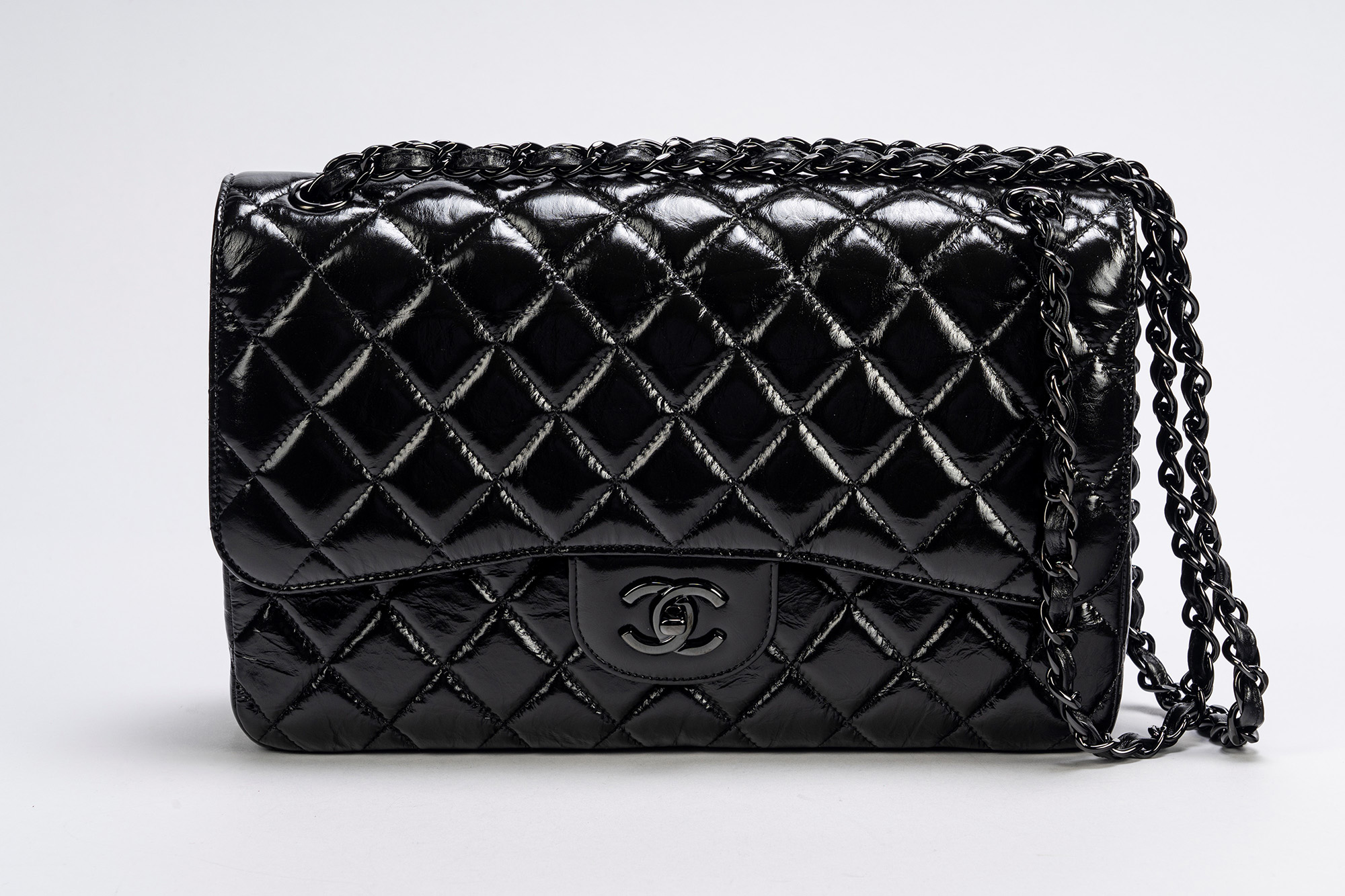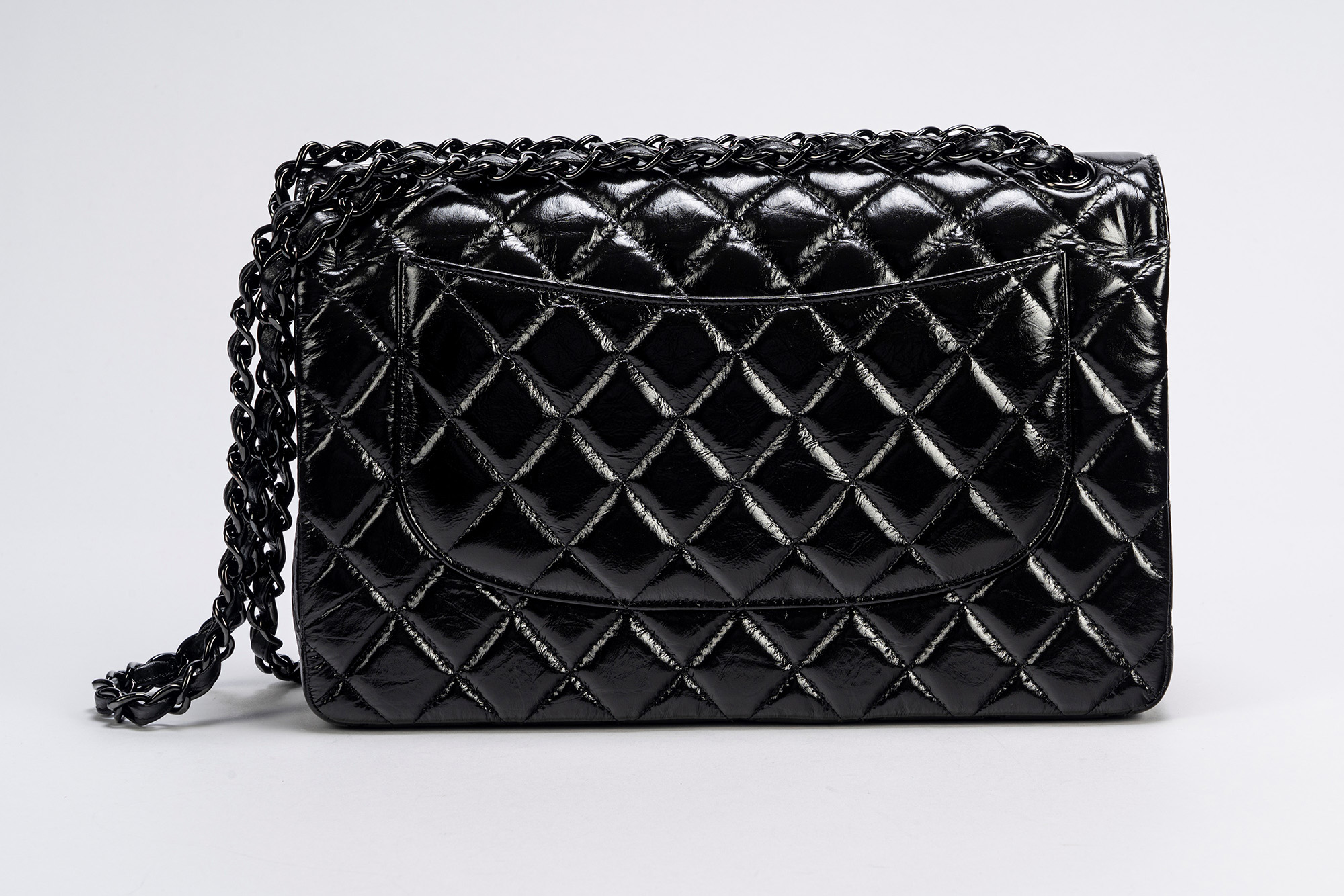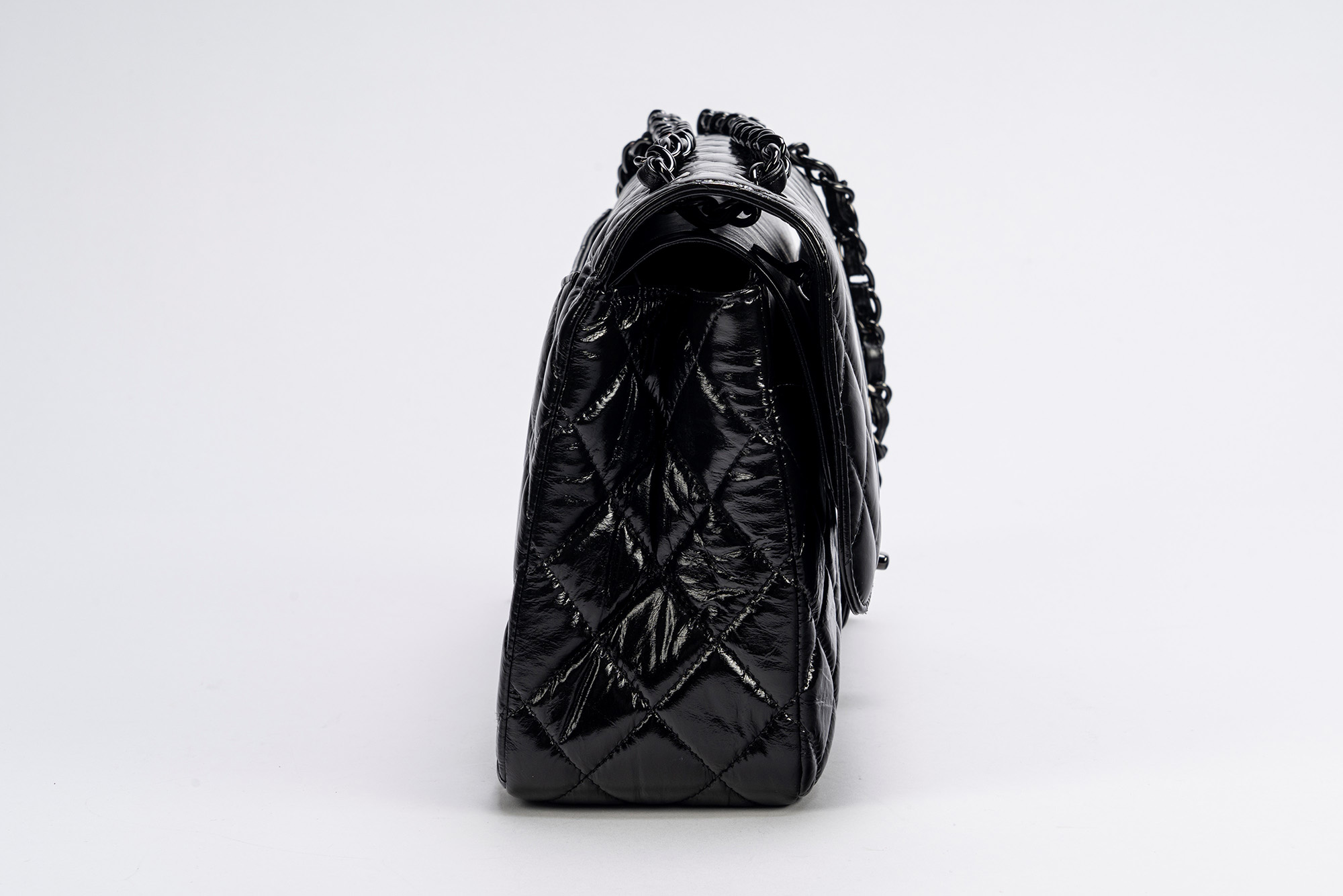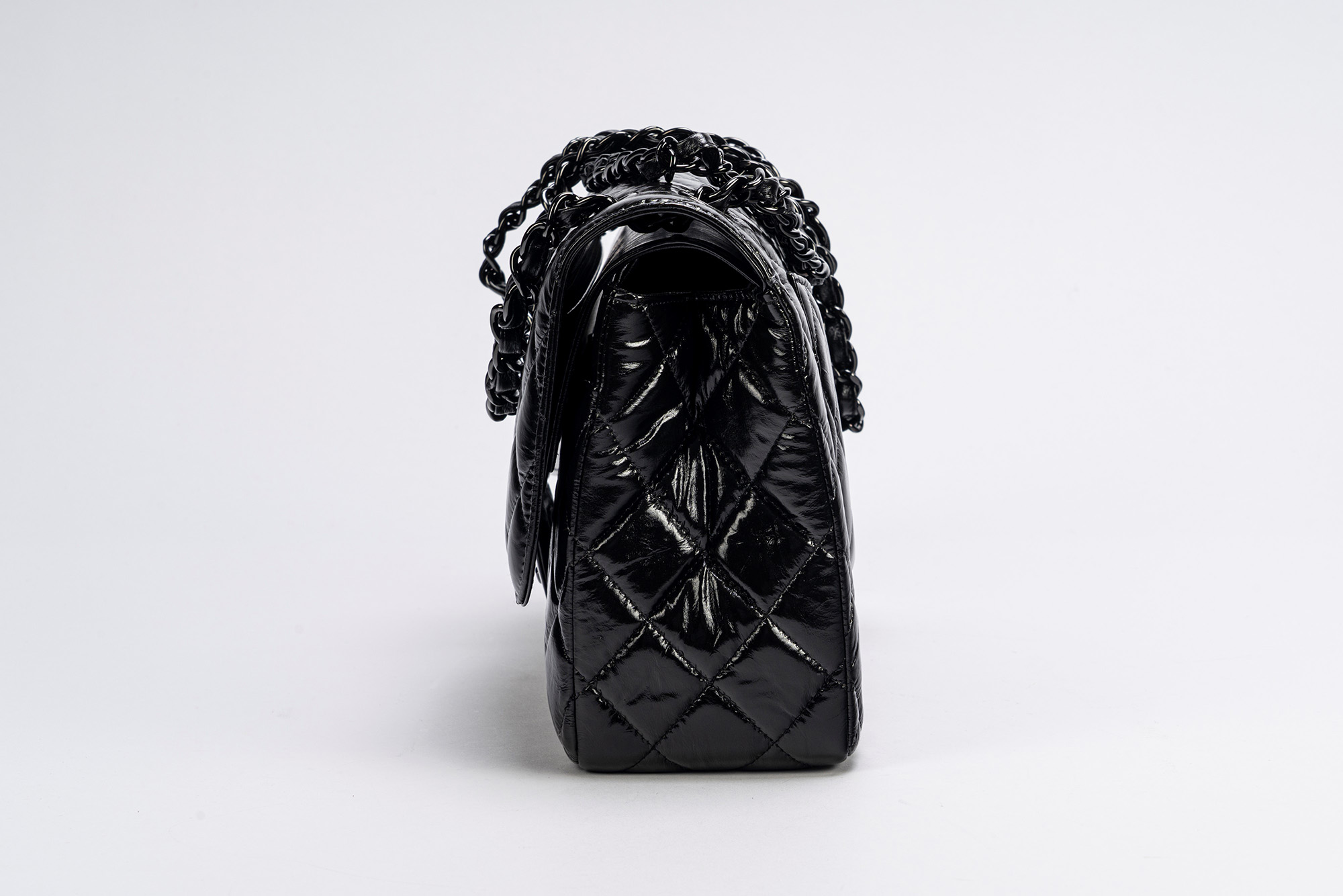 in pelle matelassé verniciata e stropicciata, tracolla a catena e dettagli in metallo brunito, cm 30, con sacchetto e scatolain pelle matelassé verniciata e stropicciata, tracolla a catena e dettagli in metallo brunito, cm 30, con sacchetto e scatola
