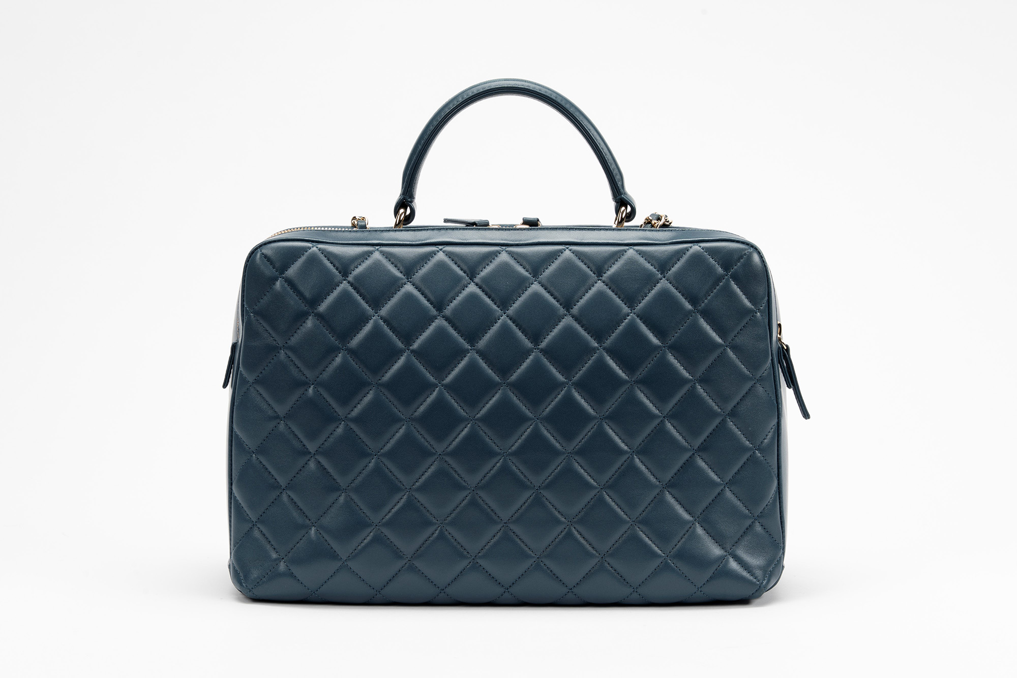 in pelle matelassé color blu, doppio scomparto interno, interno in pelle color bordeaux, dettagli in metallo dorato, manico e tracolla a catena staccabile, cm 35in pelle matelassé color blu, doppio scomparto interno, interno in pelle color bordeaux, dettagli in metallo dorato, manico e tracolla a catena staccabile, cm 35