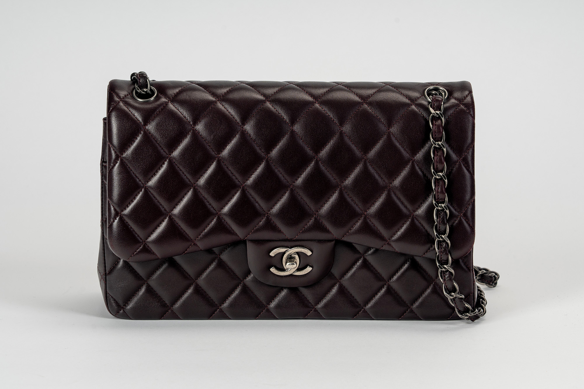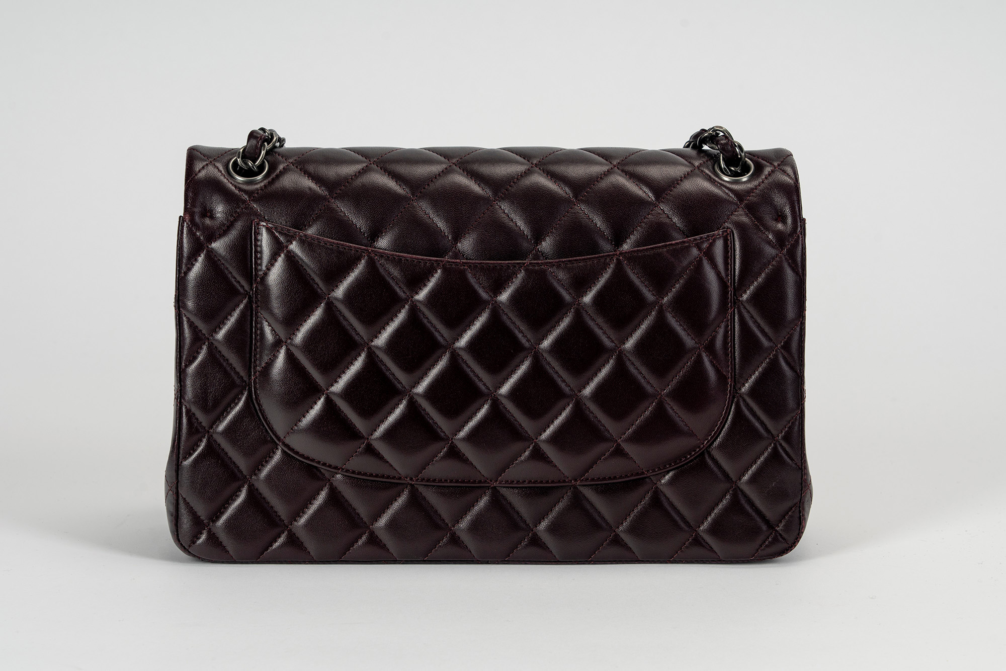in pelle matelassé color melanzana, con tracolla a catena, dettagli in metallo brunito, cm 30, con sacchetto (lievissimi segni d'uso)in pelle matelassé color melanzana, con tracolla a catena, dettagli in metallo brunito, cm 30, con sacchetto (lievissimi segni d'uso)