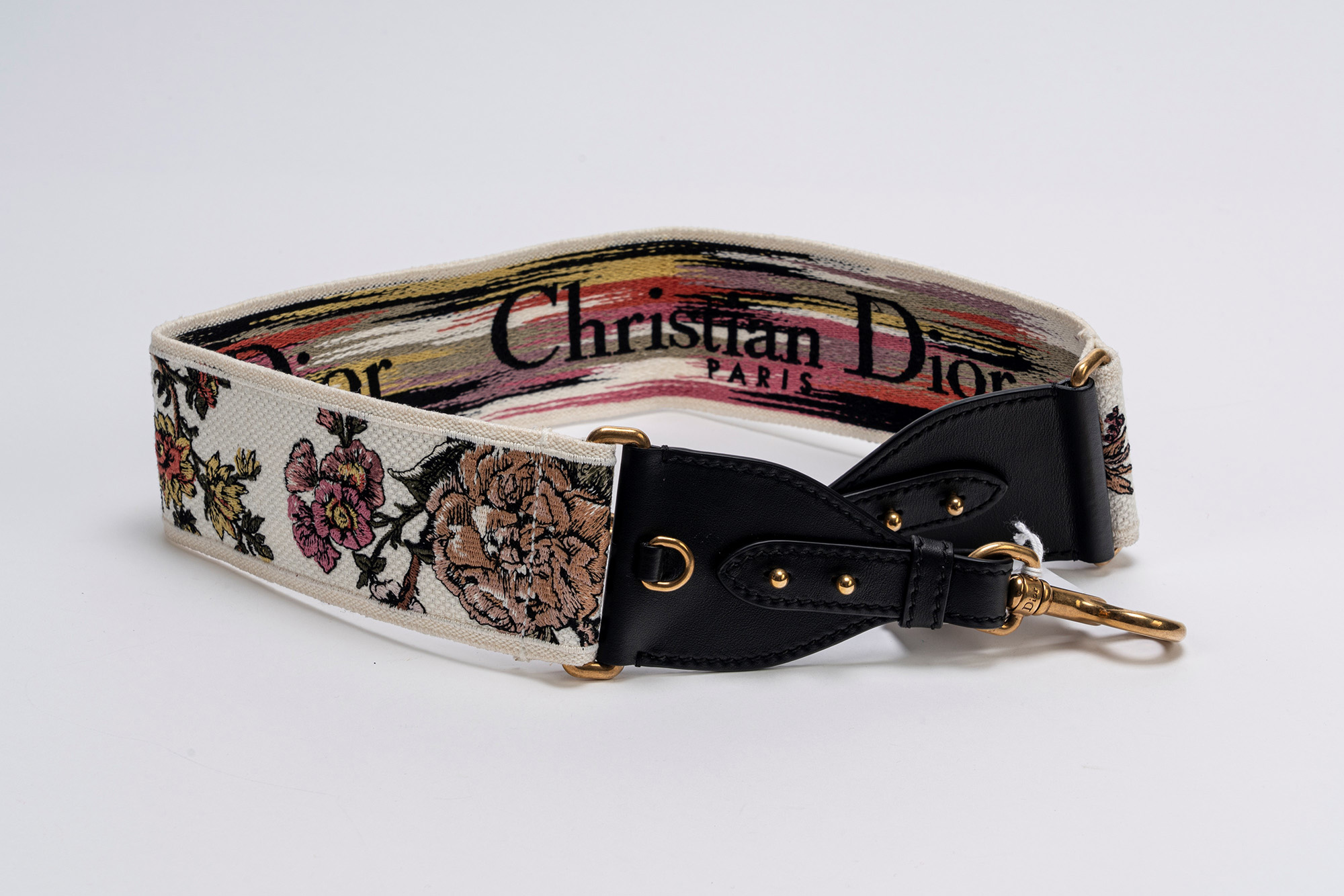 in tessuto color bianco con ricami floreali in colori diversi e pelle color nero, dettagli in metallo dorato, lung cm 81 X 6,5 con sacchettoin tessuto color bianco con ricami floreali in colori diversi e pelle color nero, dettagli in metallo dorato, lung cm 81 X 6,5 con sacchetto