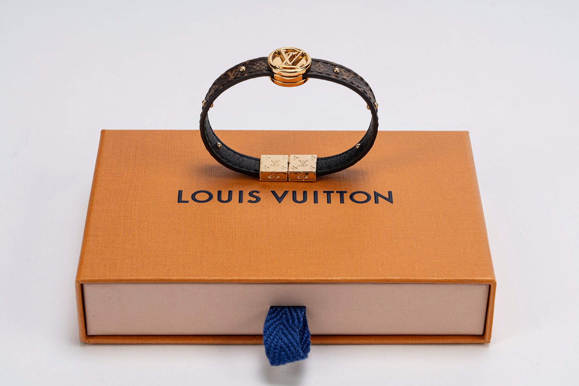 in tela monogram e metallo dorato, dm cm 5,5, con sacchetto e scatolain tela monogram e metallo dorato, dm cm 5,5, con sacchetto e scatola