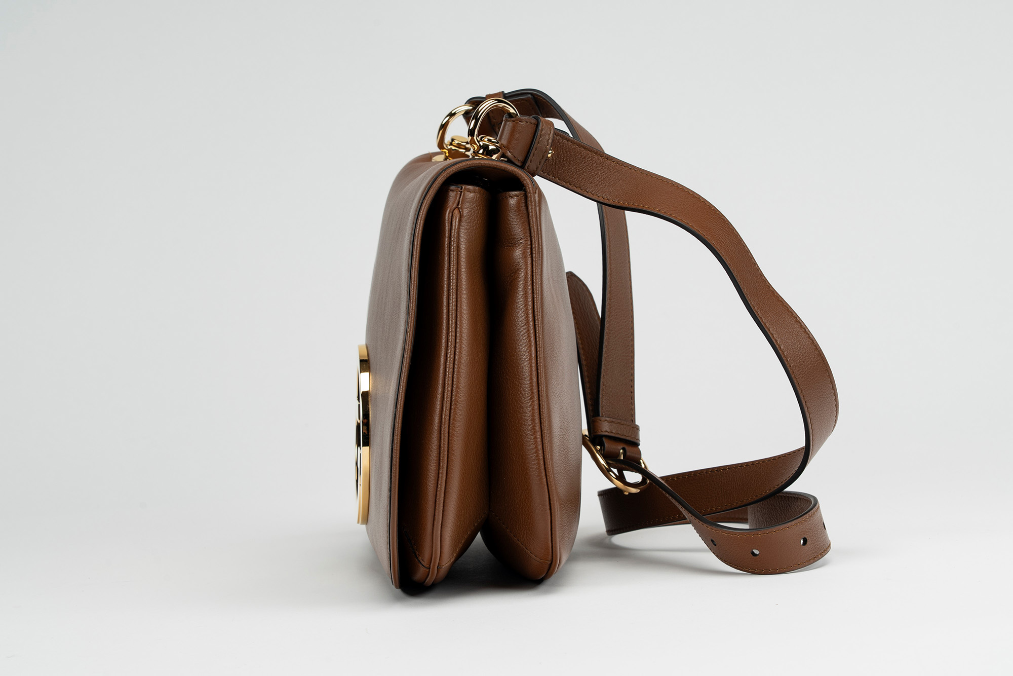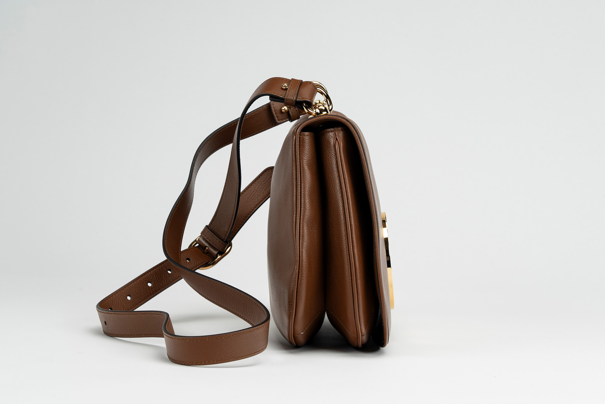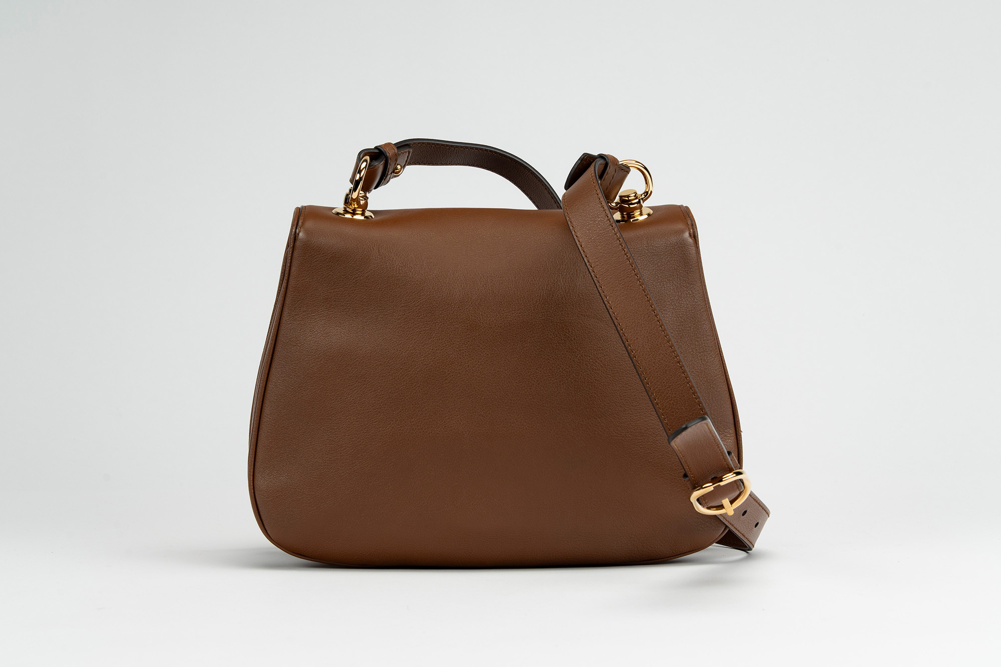 in pelle color marrone, manico staccabile e doppio tracolla in pelle e tessuto a banda web, dettagli in metallo dorato, cm 30, con sacchetto (lievissimi segni d'uso)in pelle color marrone, manico staccabile e doppio tracolla in pelle e tessuto a banda web, dettagli in metallo dorato, cm 30, con sacchetto (lievissimi segni d'uso)