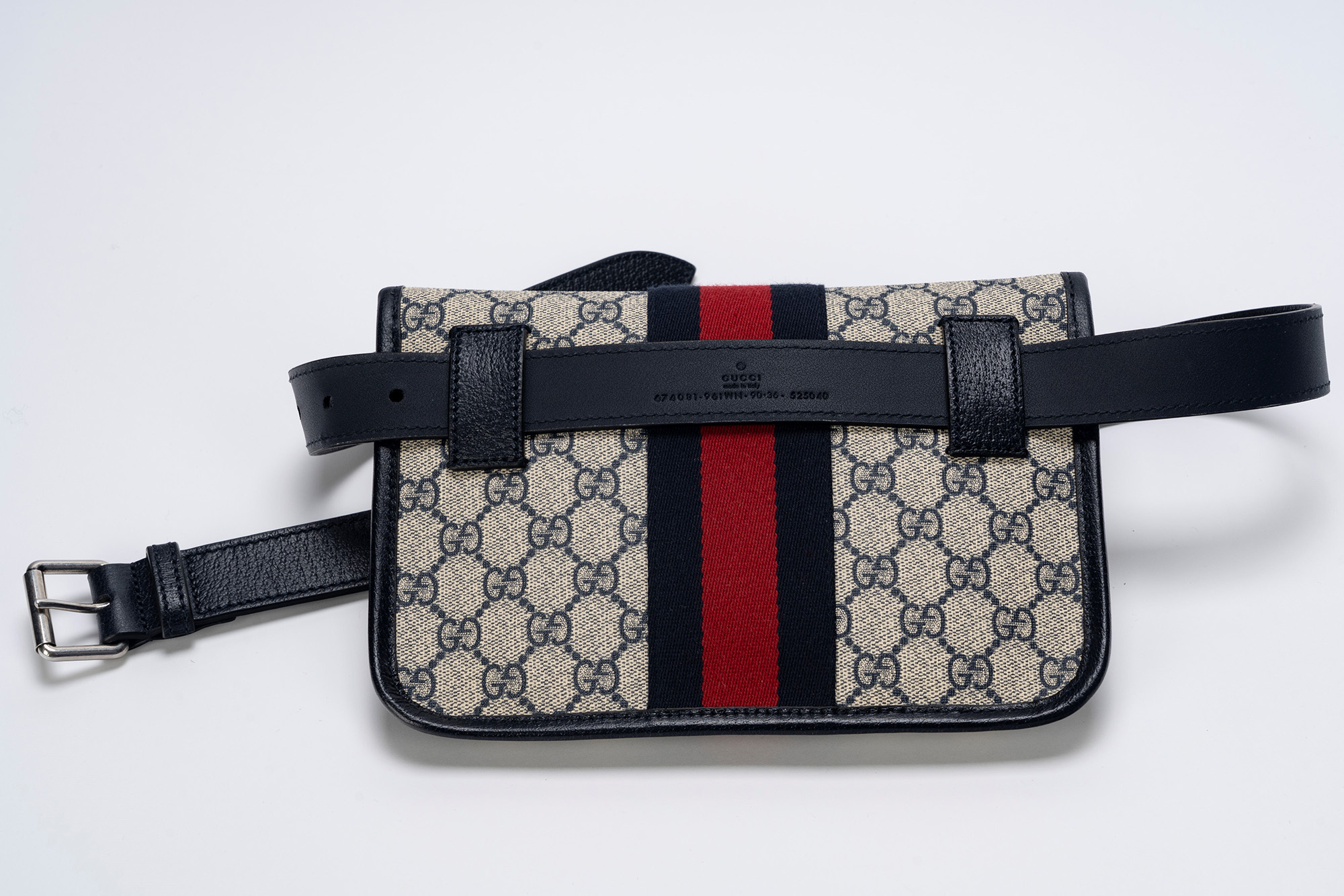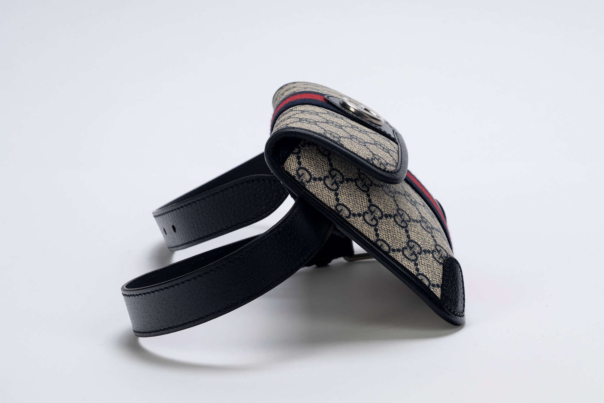 in tessuto logato plastificato bianco e blu, profili in pelle di cinghiale, banda web blu e rossa, cm 24, cintura in pendant, lunghezza massima 90 cm, con scatolain tessuto logato plastificato bianco e blu, profili in pelle di cinghiale, banda web blu e rossa, cm 24, cintura in pendant, lunghezza massima 90 cm, con scatola