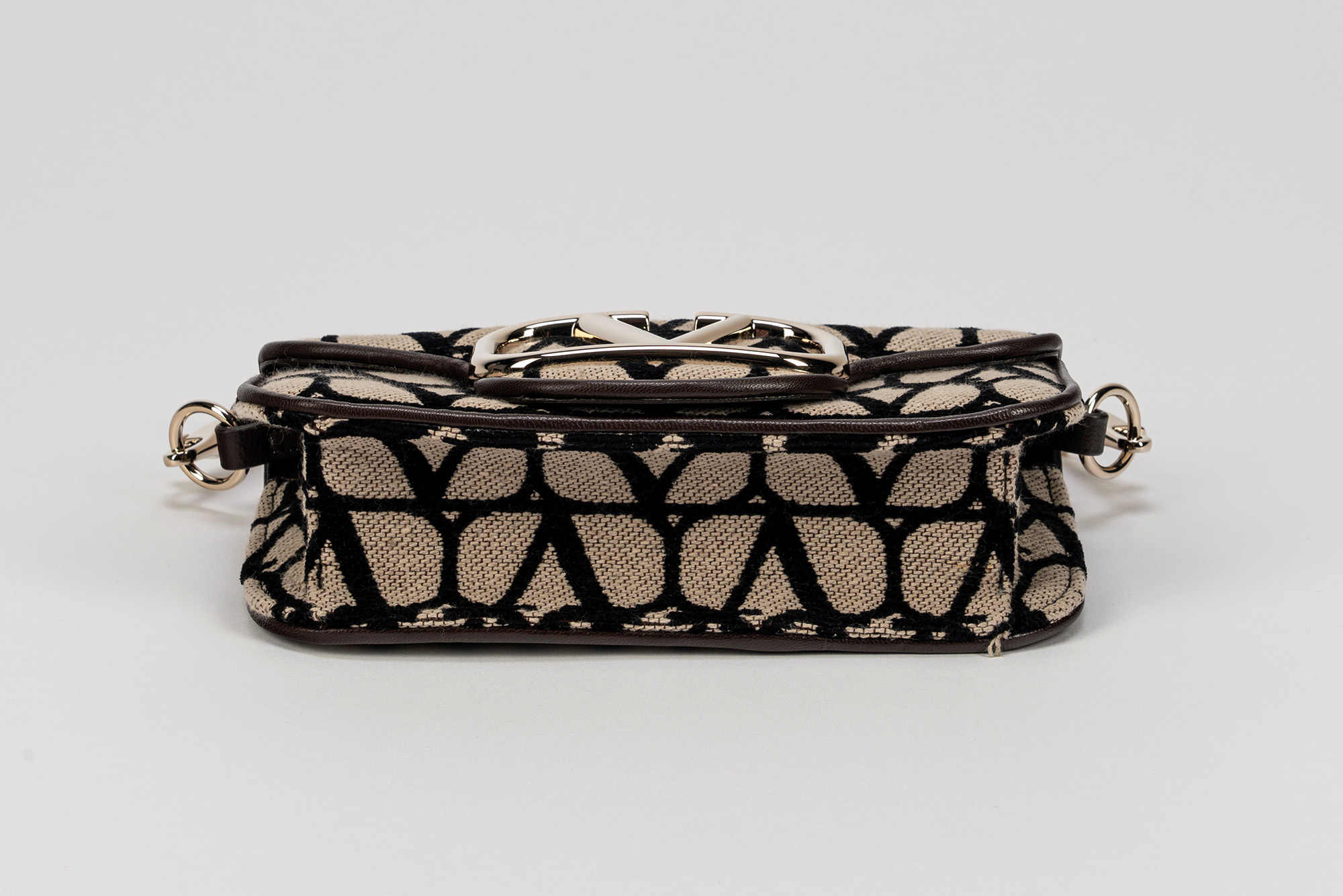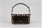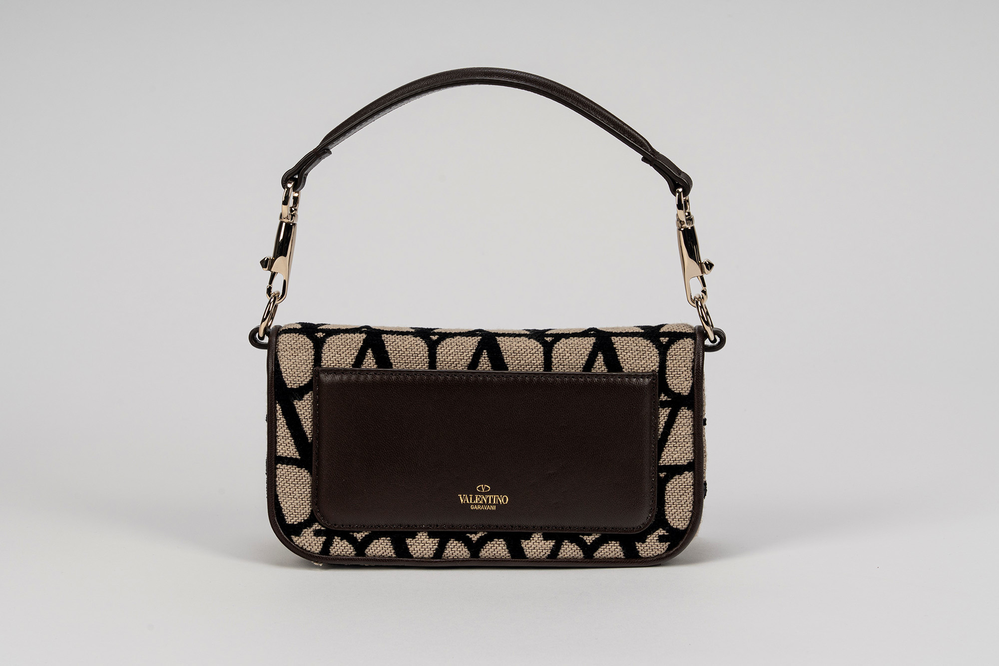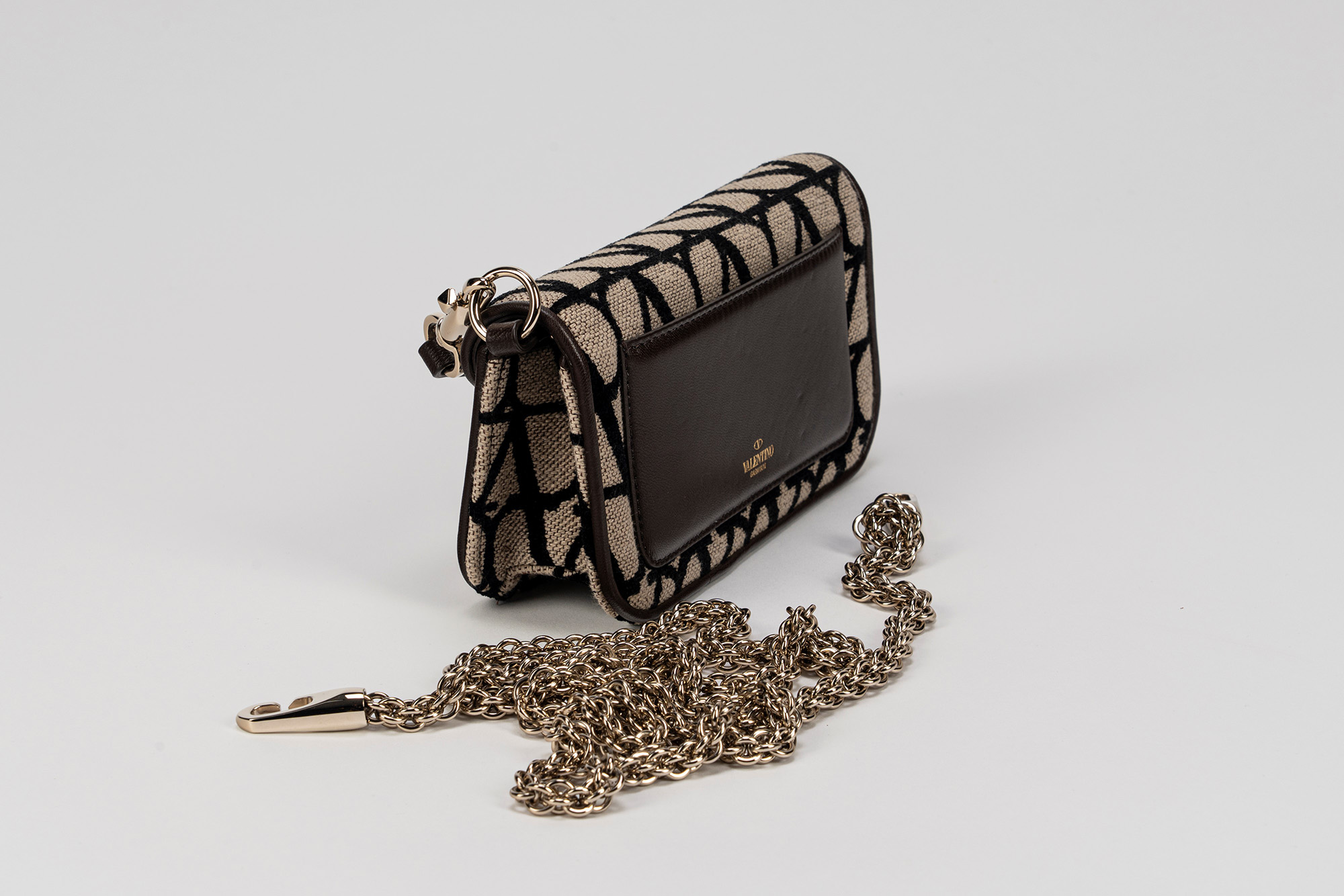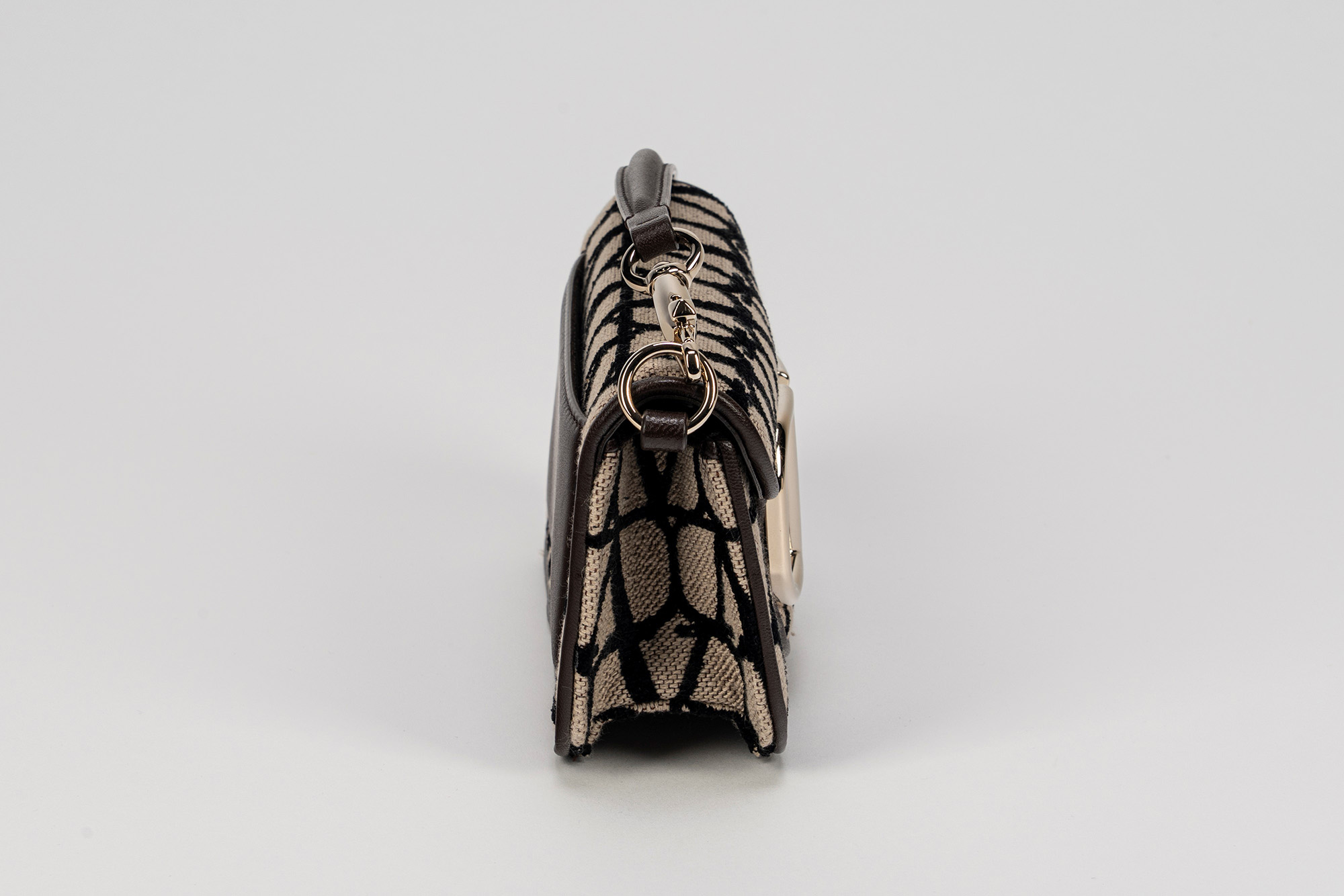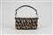 in tessuto bicolore nero e beige, profili in pelle color marrone, dettagli in metallo, manico e tracolla a catena staccabili, cm 20 in tessuto bicolore nero e beige, profili in pelle color marrone, dettagli in metallo, manico e tracolla a catena staccabili, cm 20